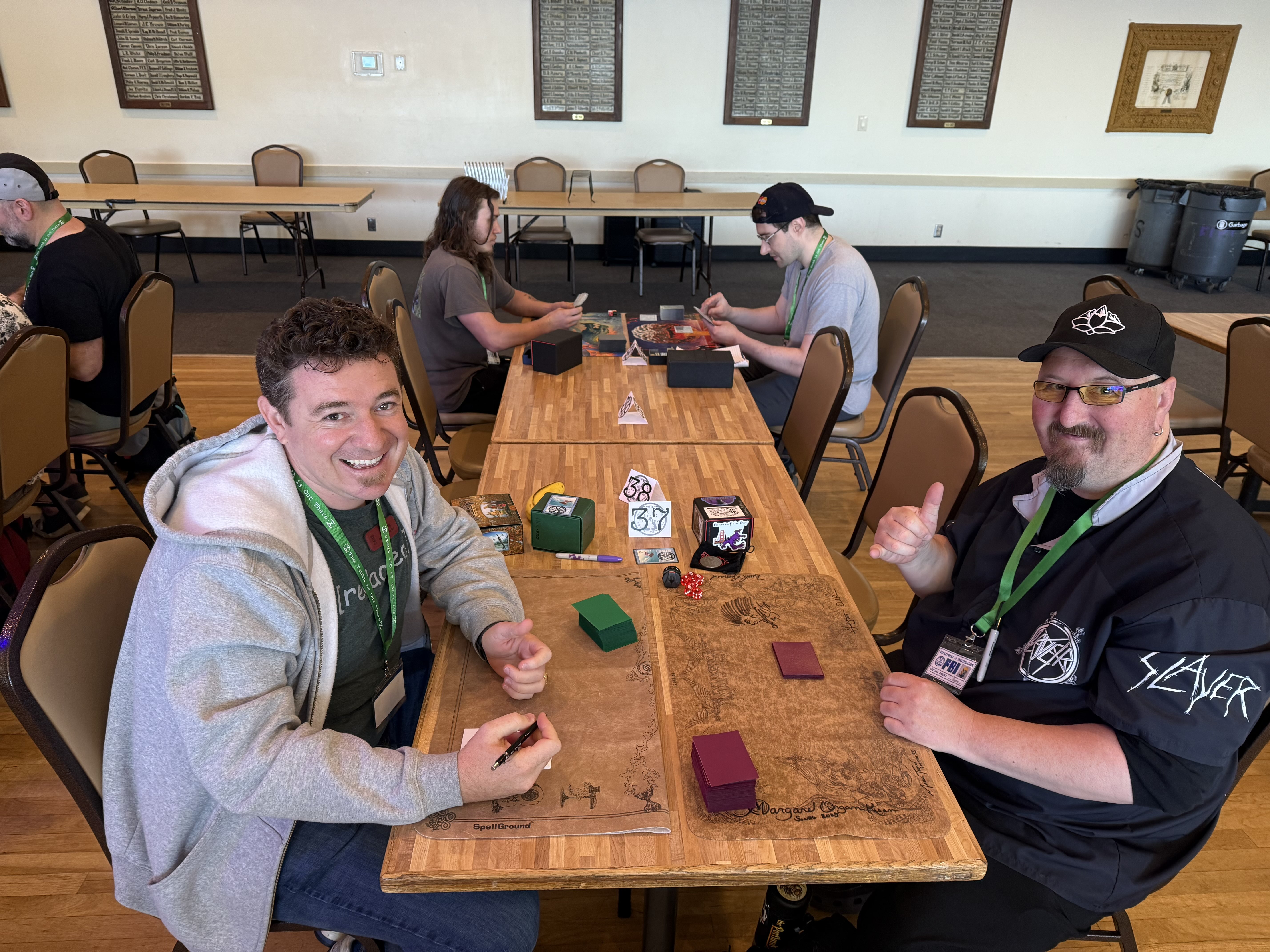 After 6 rounds, Stephen Hines of the Beasts of the Bay was the only remaining undefeated player. However, I had already announced we would play all 7 rounds, so if he lost in round 7, any of the X-1 finishers could end up winning the tournament.