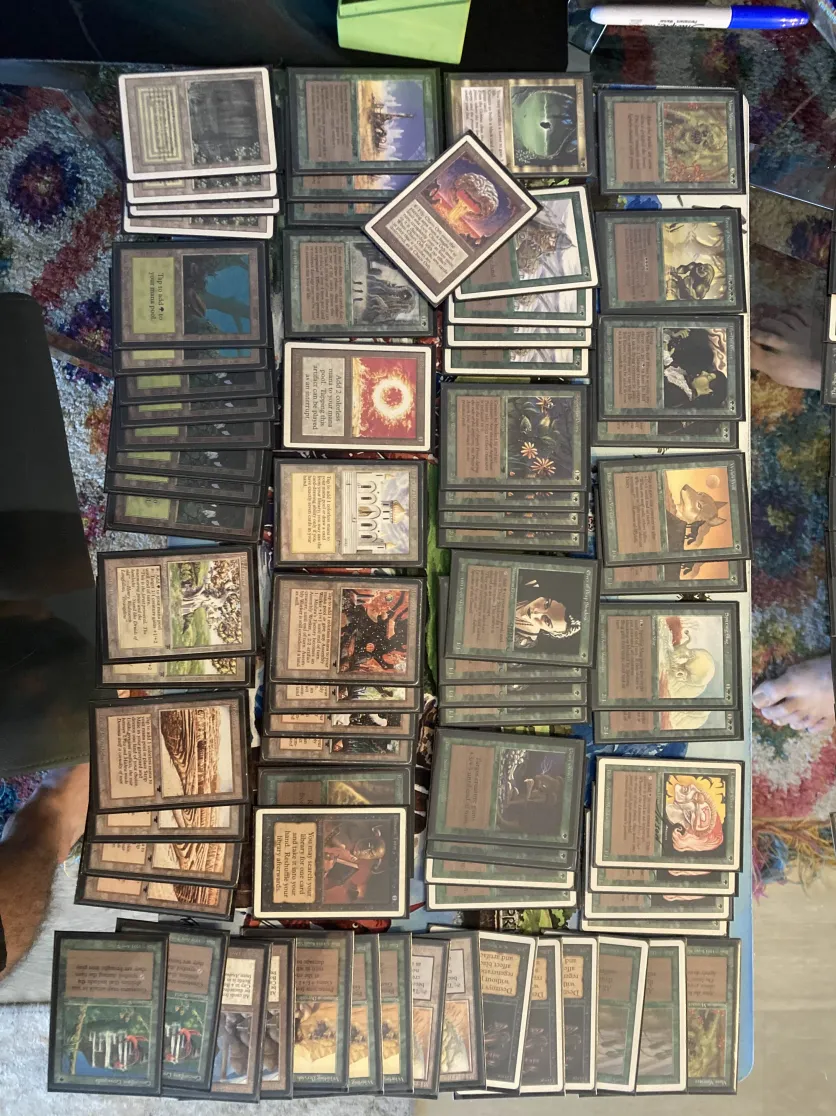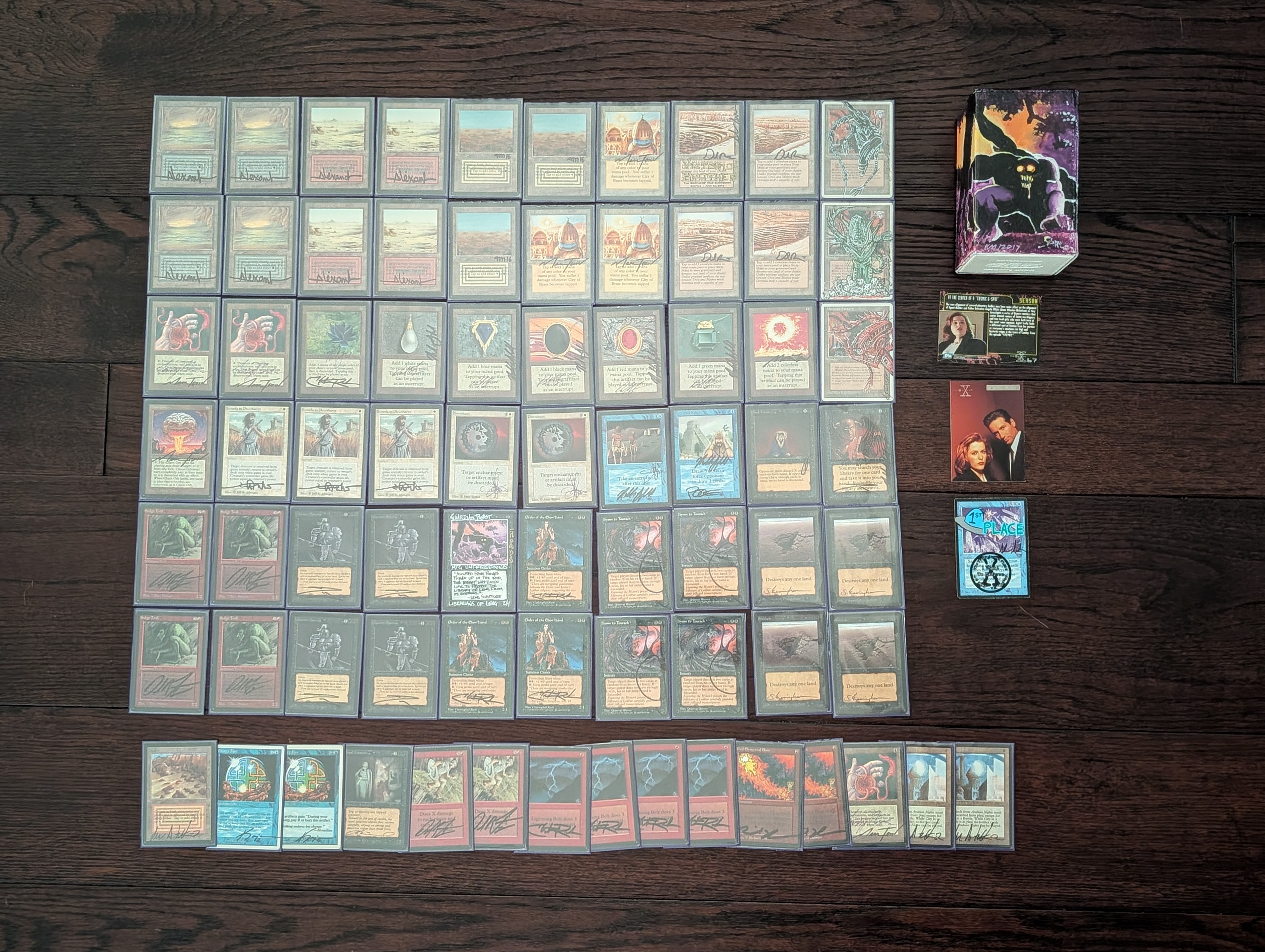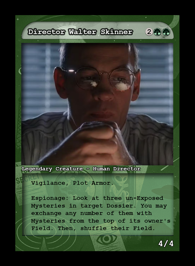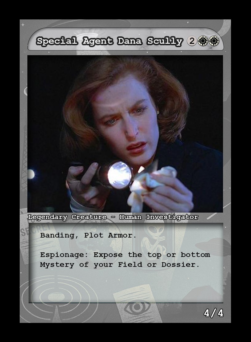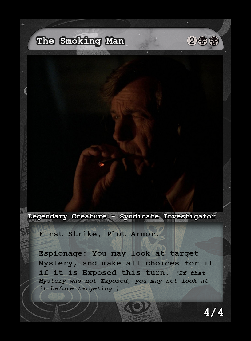 Other than the pogs, there were also 5 X-Files characters that were printed on special cards for the event, one in each color. There was Agent Mulder in red, Agent Scully in white, Deep Throat in blue, Assistant Director Skinner in green, and The Smoking Man in black. These creatures were all legendary 4/4's for four mana with no drawback, so they were already a good rate for Old School. They each also had one keyword ability, and one ability that affected the pogs that were played. Players were required to include at least four copies of these characters in their deck, but it could be advantageous to play more because of their powerful effects.