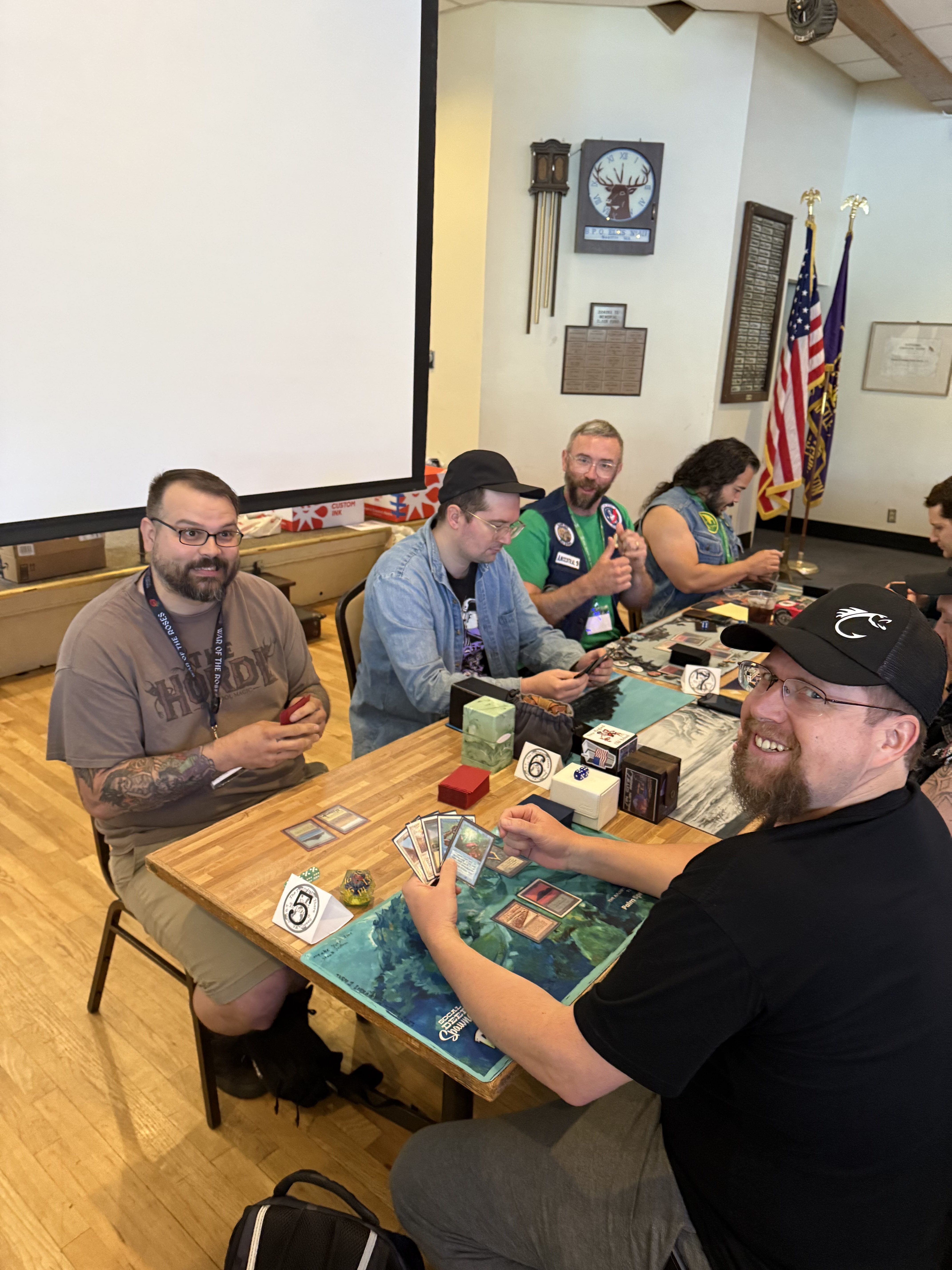 Friday's event was The X-Files: I Want to Believe, another special one-time only rule set with an X-Files theme and held at Reuben's Barrel House in the Ballard neighborhood of Seattle. Another big twist in this event besides the theme this time was the introduction of pogs to the game of Magic. Special rules added pogs to the game, with players receiving a stack of pogs to play with. The pogs had various game effects on them, and the rules gave players game actions they could take to stack up pogs and use their slammer to flip them over. Or try to at least. Any pogs that they flipped over would have a game effect, such as drawing some cards, doing 3 damage, making an opponent discard some cards, or even more powerful effects like making both players mill most of their library, making them switch life totals, or taking an extra turn. So these were very powerful effects and good strategies often involved trying to leverage the pogs in the game.
