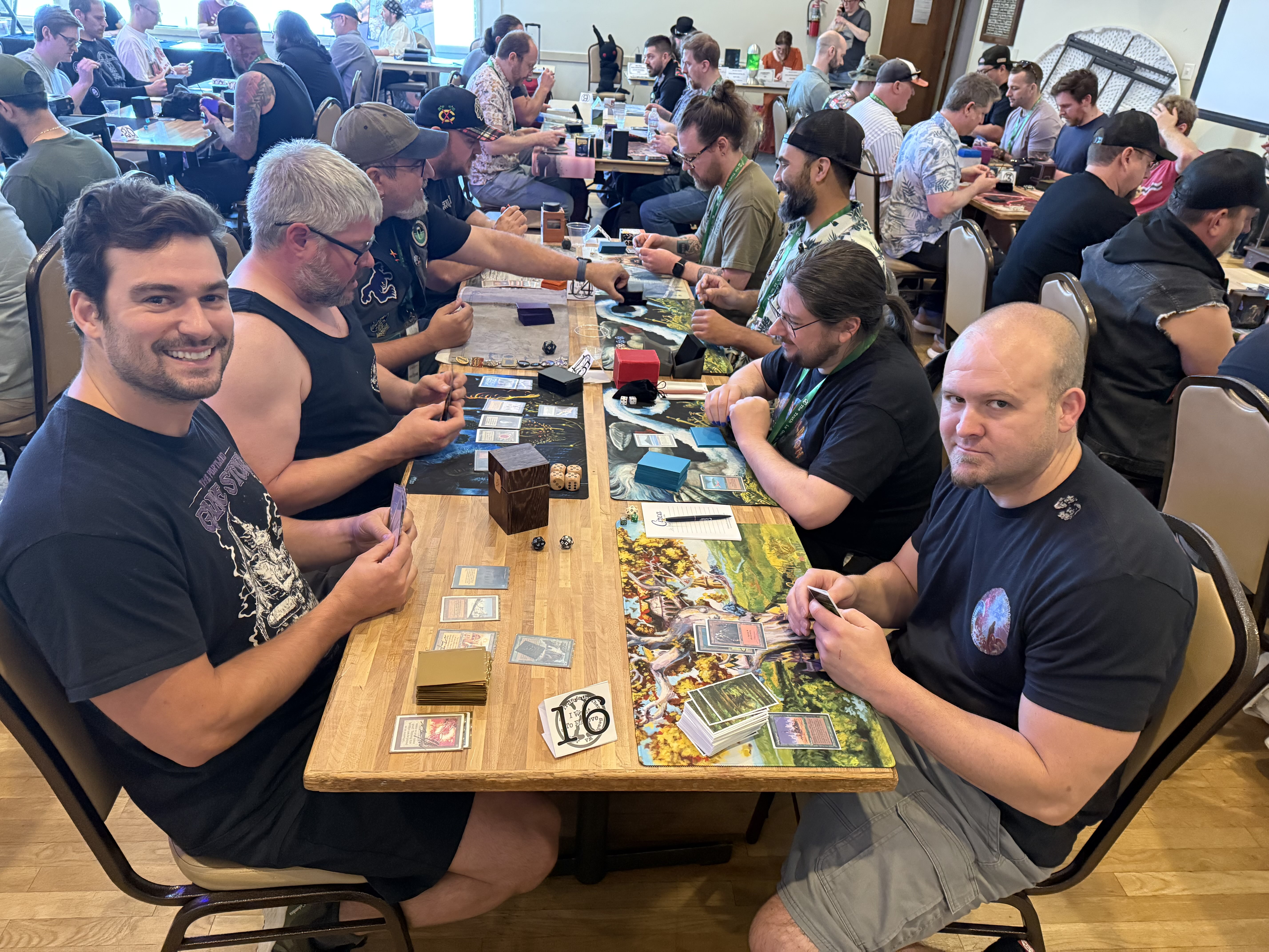 After 6 rounds, Stephen Hines of the Beasts of the Bay was the only remaining undefeated player. However, I had already announced we would play all 7 rounds, so if he lost in round 7, any of the X-1 finishers could end up winning the tournament.