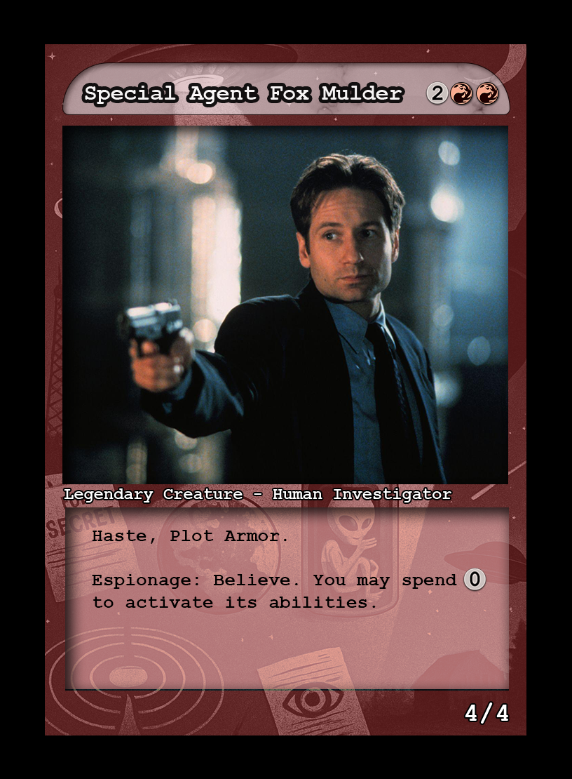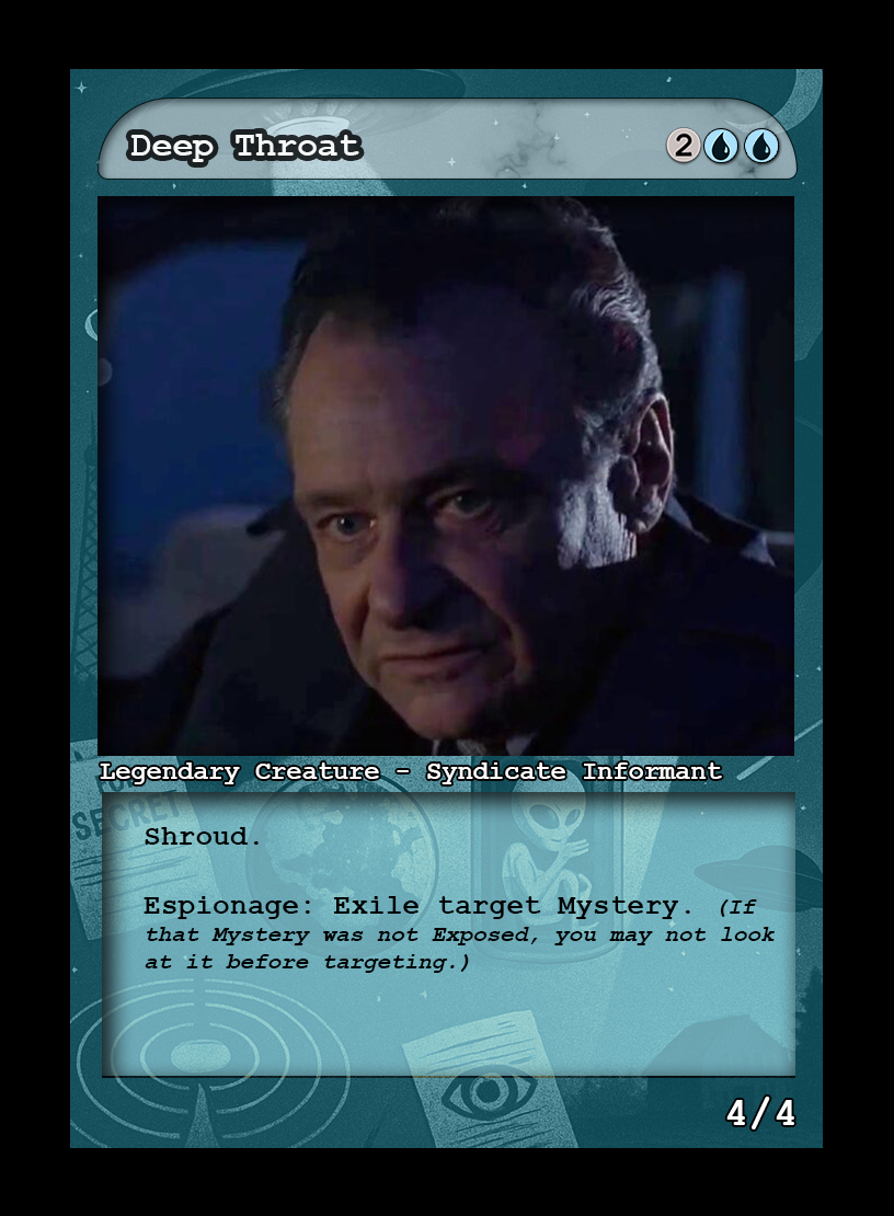 Other than the pogs, there were also 5 X-Files characters that were printed on special cards for the event, one in each color. There was Agent Mulder in red, Agent Scully in white, Deep Throat in blue, Assistant Director Skinner in green, and The Smoking Man in black. These creatures were all legendary 4/4's for four mana with no drawback, so they were already a good rate for Old School. They each also had one keyword ability, and one ability that affected the pogs that were played. Players were required to include at least four copies of these characters in their deck, but it could be advantageous to play more because of their powerful effects.