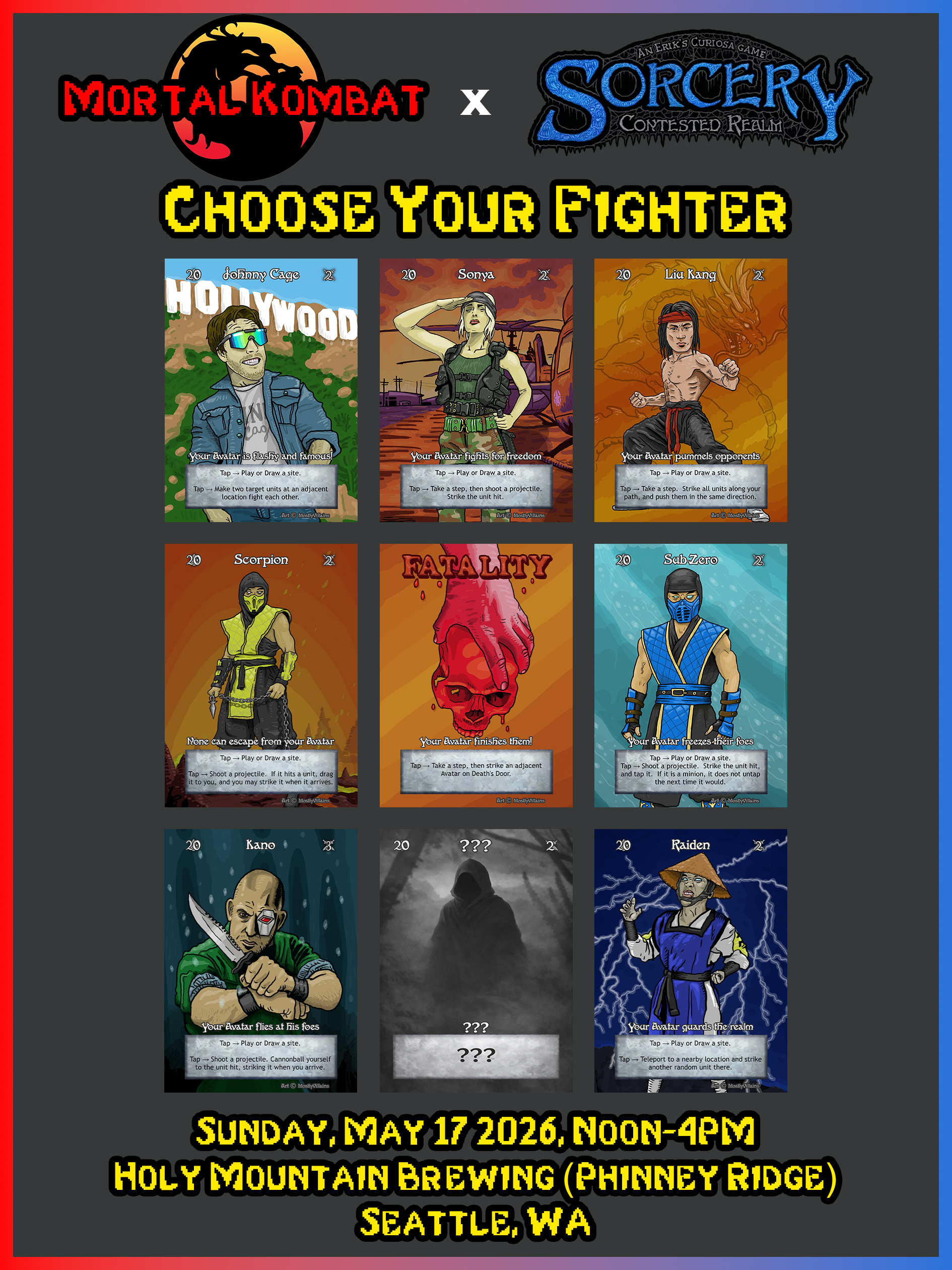 This event follows normal Sorcery rules, with the exception of choosing an Avatar. Instead of choosing an Avatar as normal, you MUST choose one of the special Mortal Kombat Avatars below as your Avatar. Players will receive a pack containing all 7 base Mortal Kombat Avatars. Every pack will include one foil Mortal Kombat Avatar (which does not replace the nonfoil version of that Avatar), and some packs will include curios.